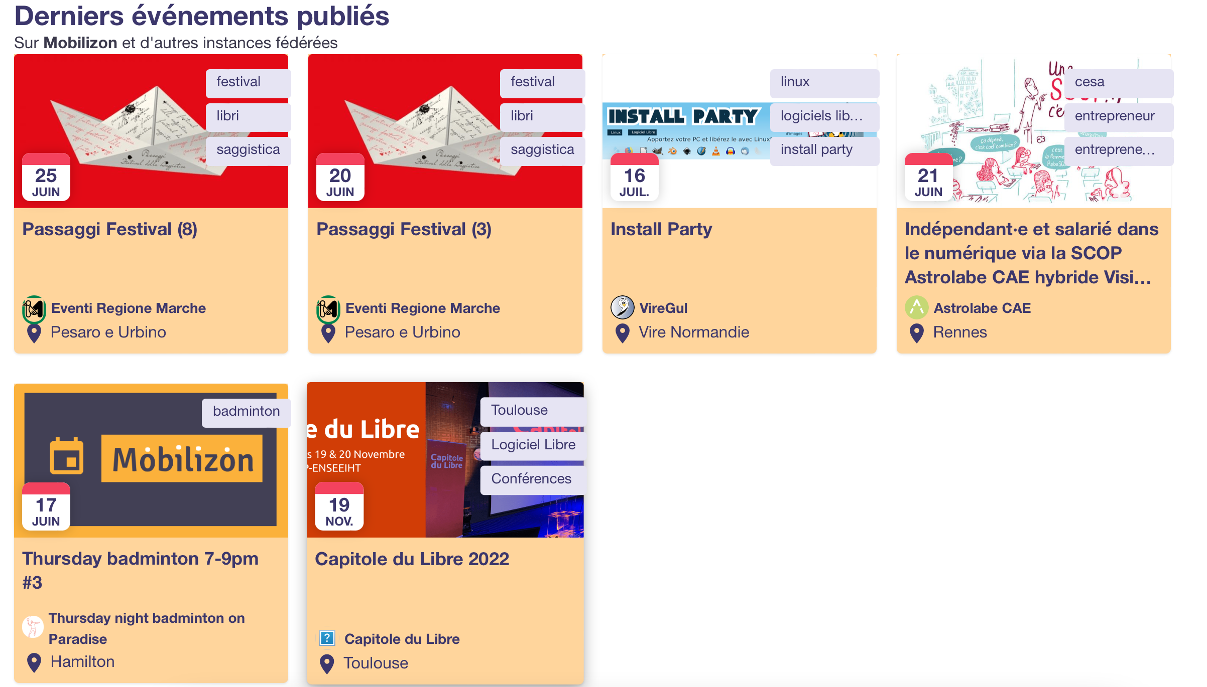 Mobilizon est un logiciel libre d’organisation d’évènements et de gestion de groupes créé en octobre 2020 par l’association Framasoft. Cet outil incarne une possibilité pour l’internaute de proposer ou de participer à des événements, sans devoir renseigner ses données personnelles. C’est une solution libre qui concurrence notamment l’onglet « Événements » que l’on retrouve sur Facebook.